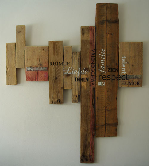 VRIJ WERK Wandornament - sloophout tekst 112 cm breed x 133 cm hoog Beeldje dame 16,5cm hoog